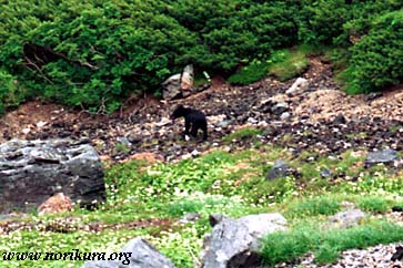 クマの出没地域は山麓に限らず、大雪渓・畳平でも、野いちごなどを求めてやってくることもあり、出没情報もあります。ご覧の画像は2002年8月13〜14日のノリクラ雪渓カレンダー取材時のときのものです。大きさは先ほどの小熊よりも一回り大きいものです。雪解けの終わった雪渓下部周辺をうろうろしておりましたが、足取りは思ったより軽く、登山道を登ってくるスキーヤーの比ではありません。