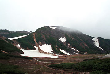 6月の下旬から7月にかけて梅雨による大雨が降ると大抵このような現象が発生します。ですから、積雪が多くて安心していてもこの鉄砲水によって平年なみかそれ以下になってしまう年が、今まで何度もありました。一度、雪渓の表面に土砂が堆積すると今シーズンはその部分は滑走不能になります。(降雨などで土砂が洗い流されることはありません)
