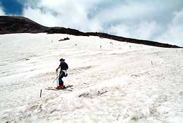 雪渓上部はまだ十分な広さがあるものの、雪面が荒れているため楽しく滑走できるエリアは比較的限られてきます。梅雨が明けると、雪面の緩んでいる時間も長くなり簡単に整地できるので、滑走エリアはある程度ひろがります(整地する・しない以前に雪がなくなってしまうこともありますが...)、それまではいろんなスタイルのスキーヤー・ボーダーが混在する形になります。お互い他人の状況を配慮しながら楽しんでください。