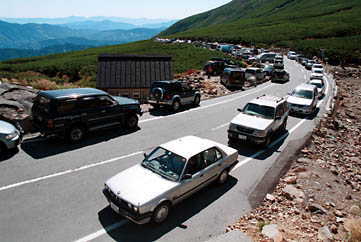 22日は渋滞を確認できなかったのですが、現地よりトップページでお伝えした通り、23日はお盆並の渋滞でした。雪渓付近に最後尾が来たのは10時くらいで、お盆のように渋滞の距離がさらに伸びることはなく、雪渓付近で最後尾はとどまっていたようです。ただ、午後になっても一向に解消されることはなく、15時くらいになってようやく車の数が減ってきた感じでした。