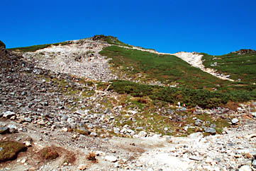 先週と比較すると赤いところが増えてきましたがまだまだ。早くから赤くなっている部分はすでに枯れ始めています。でも、大雪渓付近ではしばしばよくあることです。