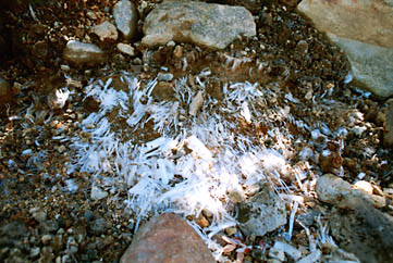 明け方からしばらく時間が経ってしまいましたので横に倒れてしまいましたが、5センチほどの霜柱です。日の当たらないところでは午後になっても融けずに残っています。日中の日差しは夏場のものを感じさせるのですが、気候は完全に秋です。