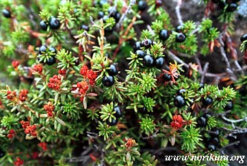ガンコウランは雌雄異株で、黒い実がなっているのが雌株。赤い花がついているのが雄株です。