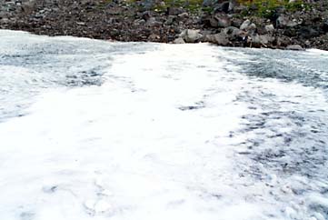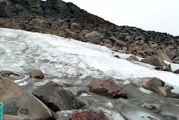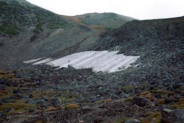 先週と比較して、全体の大きさには変化はさほど感じませんが、雪渓のふちの輪郭がだいぶギザギザになってきて、下の地面の起伏の状態を表しています。雪渓そのものの積雪量がかなり減ってきていることをあらわしています。