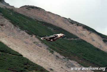 ご覧の画像ではハイマツの実を銜えていませんが、こちらを威嚇するかのように頭上すれすれのところをかなりのスピードで飛んでいきます。頭上を通過する時の風切り音にはかなり驚かされます。一瞬のできごとですが、もっと大きな鳥にもで襲われたかと思ってしまうほどです。