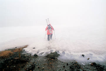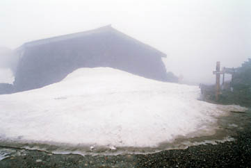 いよいよ、6月です。今回は台風4号から変わった低気圧の影響でご覧のようなひどい濃霧です。しかし、大雪渓まであがって来られただけでも良かったのかもしれません。前日の乗鞍スカイラインは通行止め、そして、今日もシャトルバスの始発は9時になってやっと運行が開始されたものの、ご覧のような濃霧で午後には運行が取りやめとなり、下り最終便は15時くらい繰り上げられました。