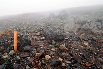 畳平から肩の小屋方面に向かいます。富士見岳と畳平の水源である不消ヶ池(きえずがいけ)を見ながら30分ほど歩くと、コロナ観測所へ向かう道路と肩の小屋に向かう道路との分岐点に差し掛かります。ここに到達するとそれまでの風景から一変し、大雪渓の大パノラマが飛び込んでくるはずなんですが、今回はお伝えしているように濃霧の中で全く見えません。
