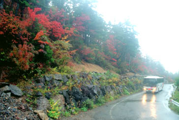左の画像が2番目の石畳の付近。ナナカマドに関してはほぼピークといってもよいくらいの色合いですが、ミネカエデやダケカンバはちょっと緑が残ったものもあります。その様子は右の画像のほうがよくわかるかと思います。この右の画像は3つある石畳の箇所をさらに下り、三本滝上流のクロイ沢にかかる荒田橋を渡って数百メートル直線が続く箇所があります。ここに県道乗鞍岳線の拡幅工事の一環で新しく石垣が設置されていますが、その上からのぞいたところでバスがちょうど橋を渡っているところです。