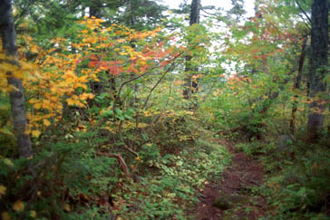 少しばかり摩利支天に続く登山道の様子をご案内します。ガードレールから登山道に足を踏み入れるとまず、沢の流れる音が耳の飛び込んできます。しばらく進むと沢はだいぶ下のほうに行ってしまいますが、絶えずせせらぎの音を聞きながら足を進めていくことになります。左の画像のように少し開けたところもありますが、ほとんどは右の画像のような朽ちた木や岩肌がきれいに苔むしている原生の森といった雰囲気で、なかなかいい感じだと思います。車道付近に比べて少し紅葉が遅れている感じですので、これから紅葉を楽しみながら足を進めていくことができるのではと思います。