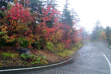 左の画像はさらに下って荒田沢橋(あれたさわ)のひとつ手前のカーブからの撮影です。まだ緑が残り、ピークまでもう少しといったところです。そして荒田沢橋方面に下って行き、右の画像が新たにできた石垣付近です。石垣の上はきれいなナナカマドの紅葉が見られますが、ごらんのように濃い霧ではっきりと映し出せないのが残念です。