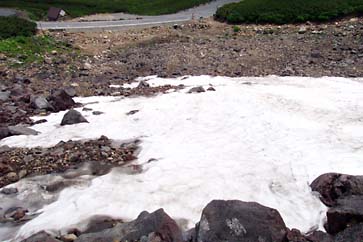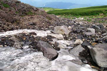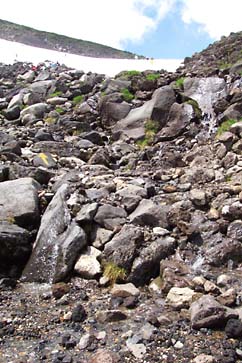 この付近は雪渓上部の雪解け水が集まるエリアで、せせらぎの心地よい音が涼しさを演出してくれます。もちろん、それだけ雪渓が小さくなっていくことには違いありませんが...