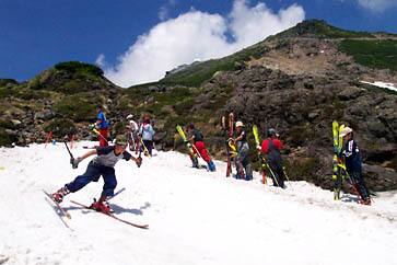 ▼ 今年も大雪渓にはたくさんのスキーヤーやボーダーの方が訪れました。マイカー規制により、訪れる人が少なくなっていますが、それでも、年々、少しずつ、スキーヤー・ボーダーが戻ってきているようで、特に5月・6月はかなりの数に上り、マイカー規制前よりも増えているのではないかと思うほどです。