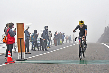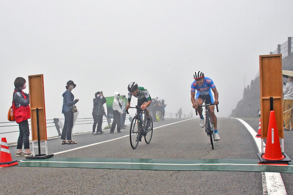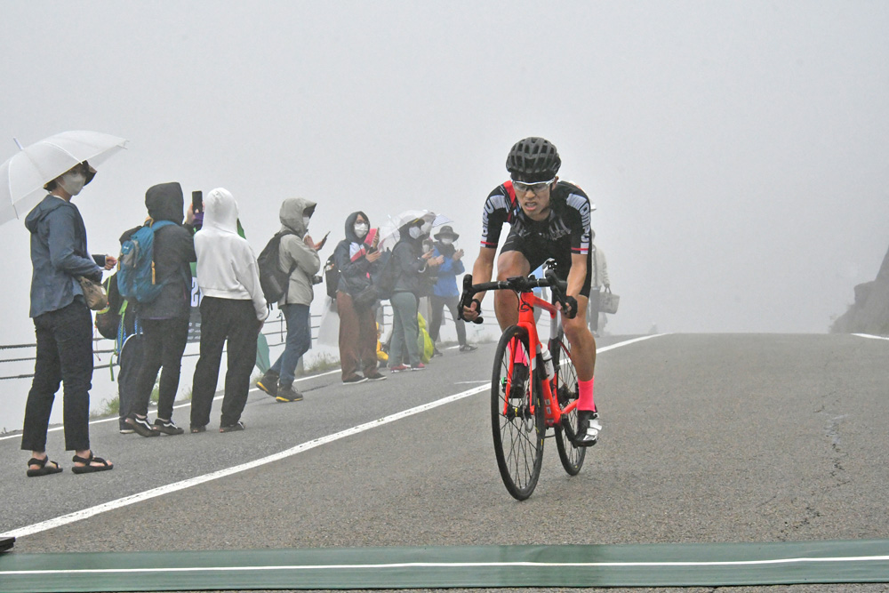ゴール付近の天候は小雨・気温10℃で風はほとんどなく、視界は50メートル程度。トップでやってきたのはe-BIKEの宮下 将一選手。タイムは0:54:22.217で大会コースレコードを5分も上回る結果で、この後のe-BIKE2位までが大会コースレコードを上回りました。