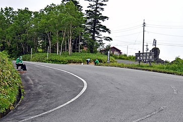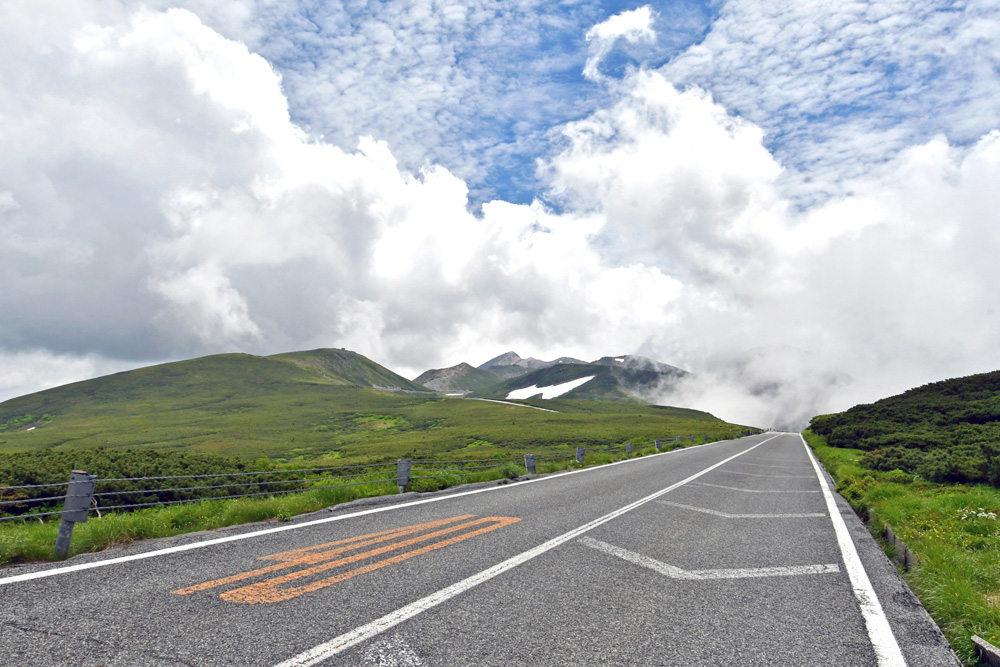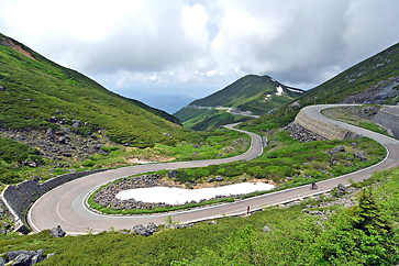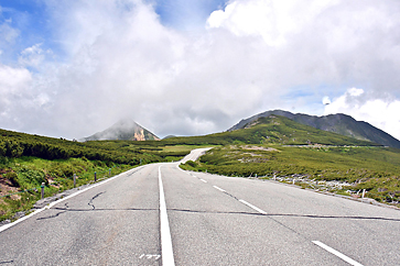 森林限界以降は道路視界も悪くなり、周囲の風景は残念ながら何も見えなくなってきました。乗鞍スカイラインは北アルプス山々に囲まれた山岳風景が楽しめる点が大きな魅力ですから残念です(右側の画像は、前日に撮影した四ッ岳カーブ)。