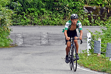 e-BIKEの2選手がトップを貫いていますが、ロードバイクで最初にやってきたのは男子Dの真鍋 晃選手で、 それに続くのはチャンピオンクラスの尾崎 佑司選手。平湯峠から夫婦松までの約3kmの間で、真鍋 晃選手はチャンピオンクラス2選手を抜き去って、タイム・順位ともに1位を確保しています。