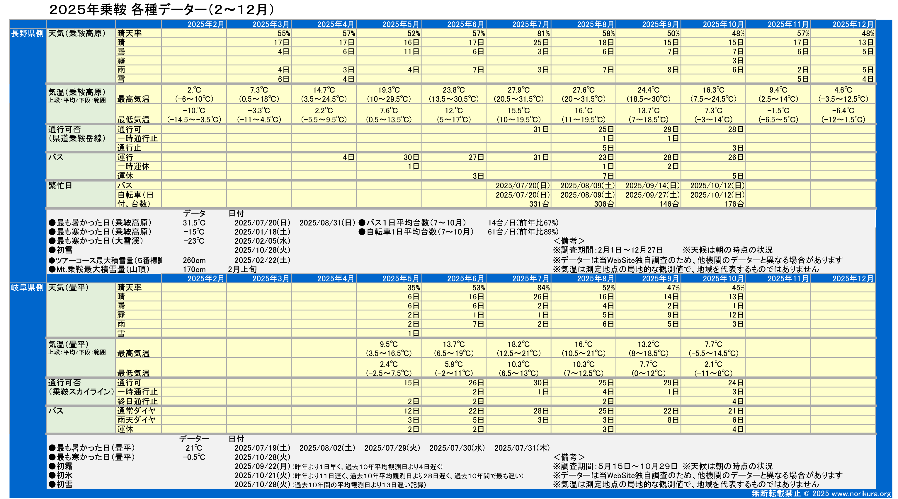 | 初霜 | 初氷 | 初雪 | 初冠雪 | 最終通行日(※2) (乗鞍スカイライン) |